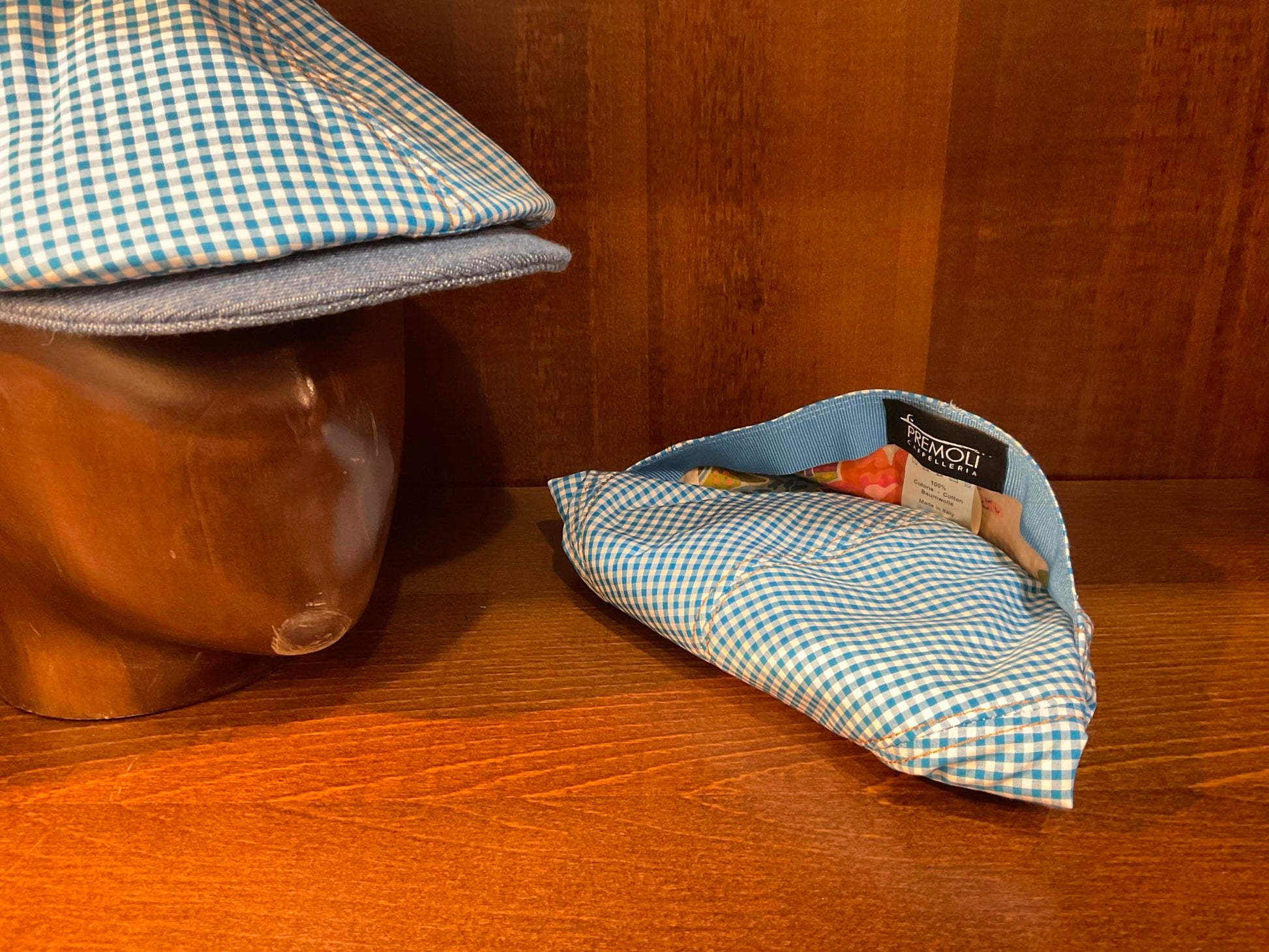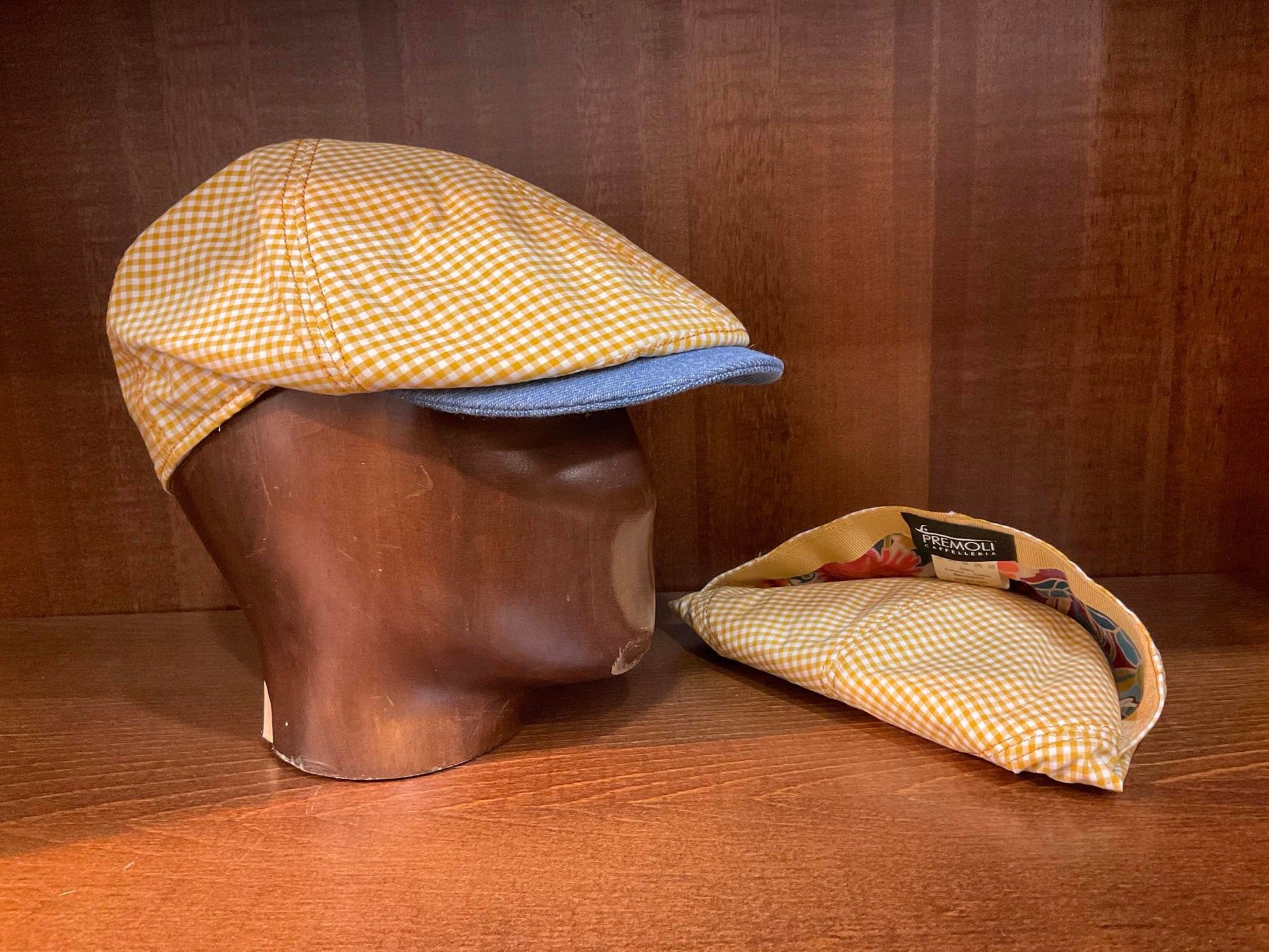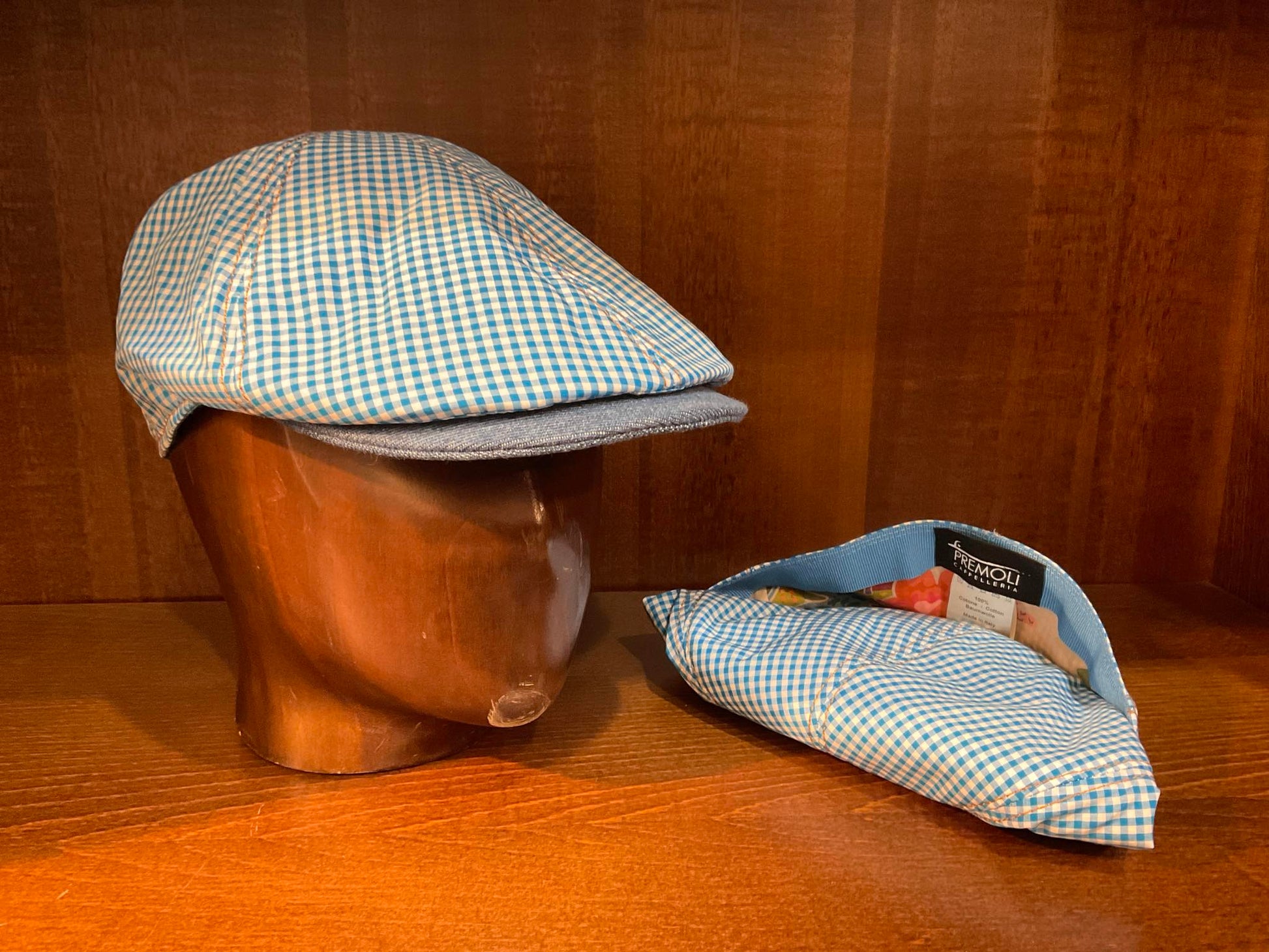 Il Duck cap tessuto a quadri è una sperimentazione della ditta Premoli pensata per i clienti che anche d'estate non vogliono rinunciare all'originalità e alla loro eleganza. Il tessuto utilizzato è quello delle camicie, in cotone leggero con visiera e inserti laterali jeans. La freschezza e la leggerezza del tessuto lo rendono estremamente morbido e pieghevole tanto da poterlo riporlo in una tasca. Il tessuto è naturalmente prodotto in Italia, come italiane sono le mani sapienti delle maestranze che lo hanno creato.