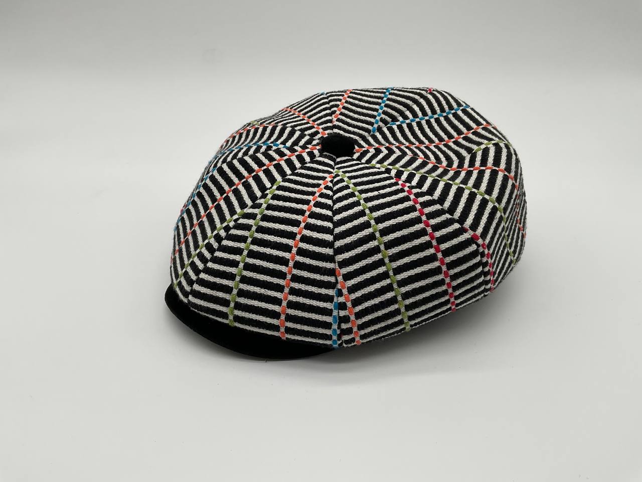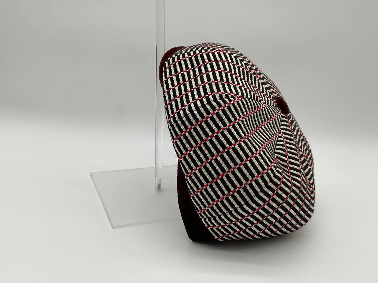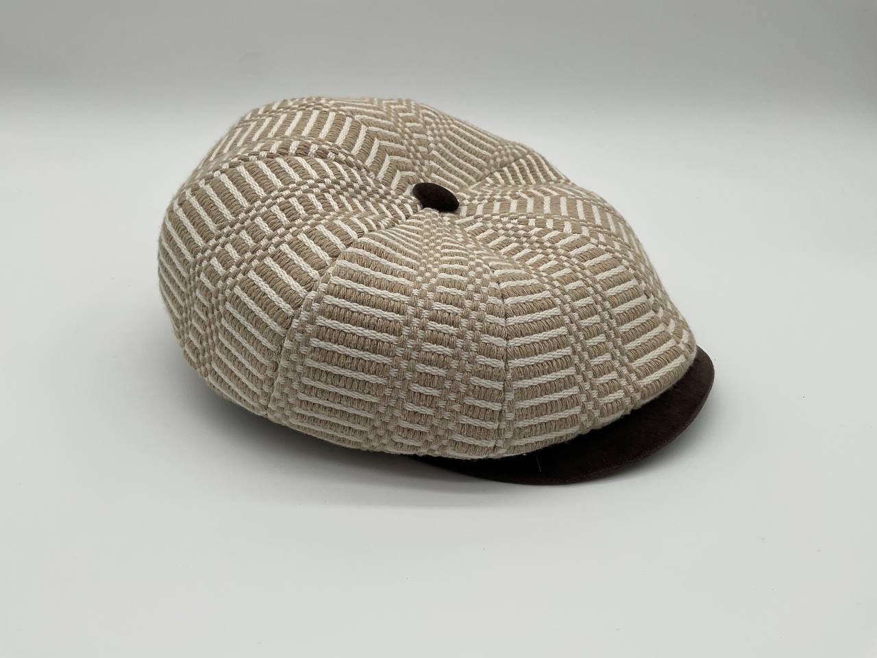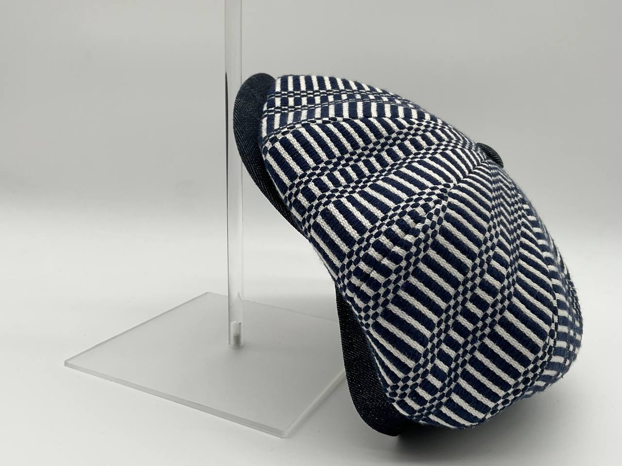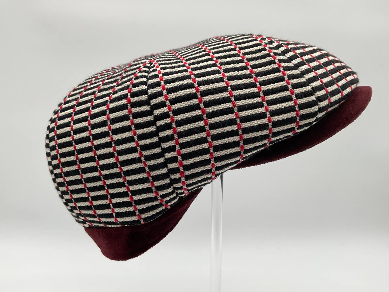 Il Newsboy ricorda il tipico berretto da "strillone" dei primi del novecento, con la classica visiera rigida e curva ma un corpo più rotondo composto da otto pannelli con un bottone in cima. Un berretto unisex, simbolo di stile retrò. In questa versione è in tessuto “Bisaccia” di cotone. La trama presenta un motivo geometrico con righe verticali in alternanza di tessuto rosso e blu o bianco e colore (rosso, blu, beige, verde, rainbow, nero), tipica lavorazione di intreccio Sardo. Visiera, bottone centrale e fascia circonferenza sono in tessuto jeans, o velluto in contrasto. La fantasia rimanda alle tradizionali stoffe utilizzate per realizzare tappeti e la tipica bertula”, la bisaccia Sarda che i pastori utilizzavano per contenere i viveri.