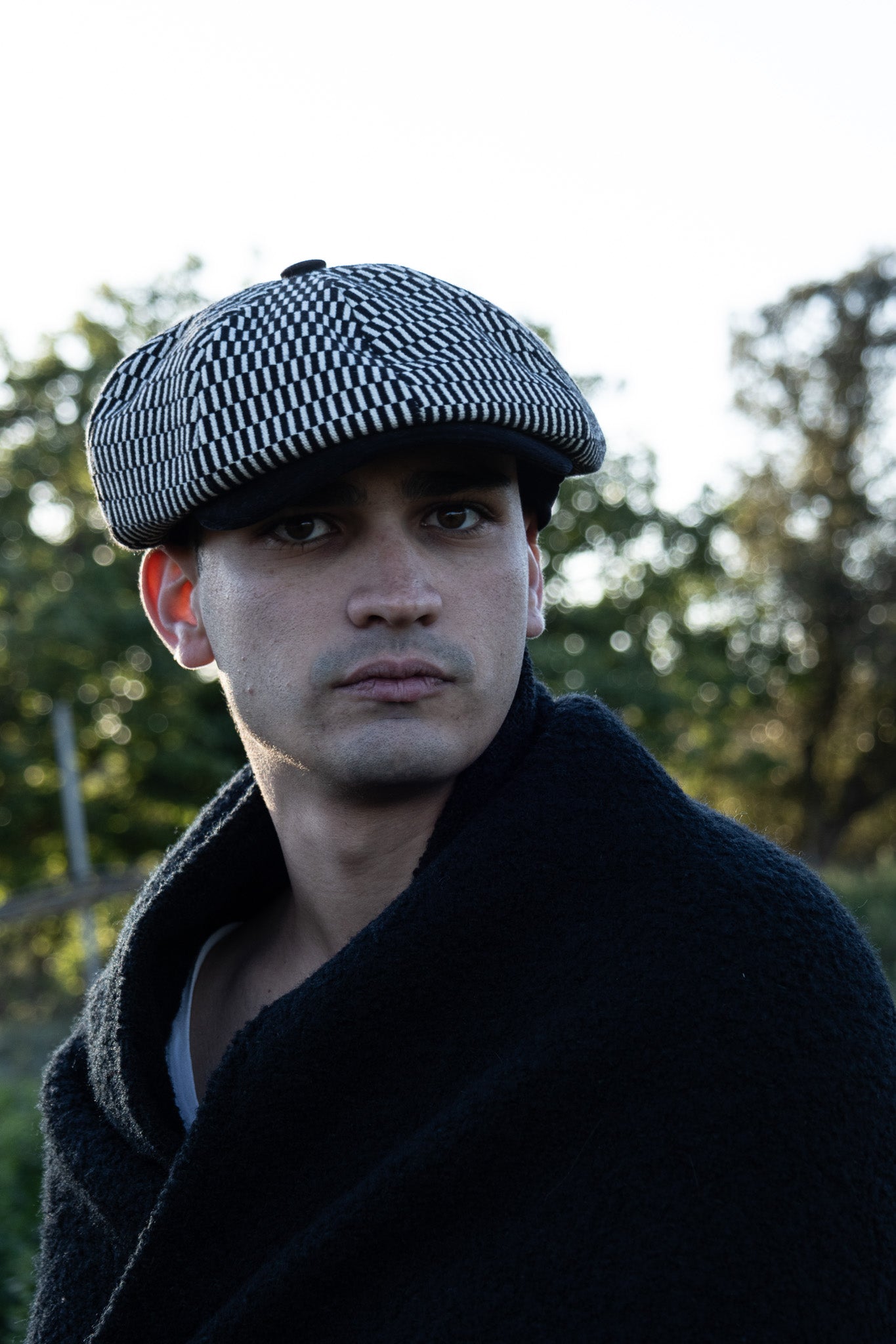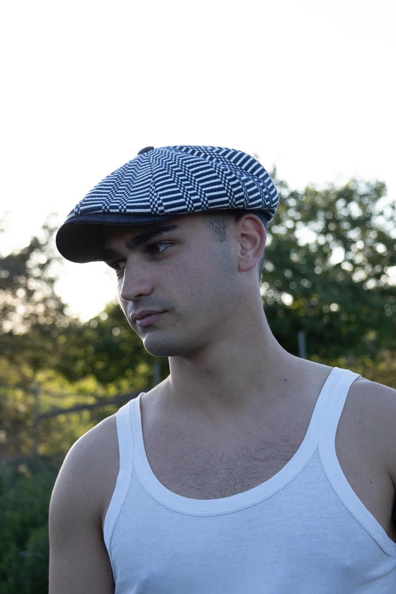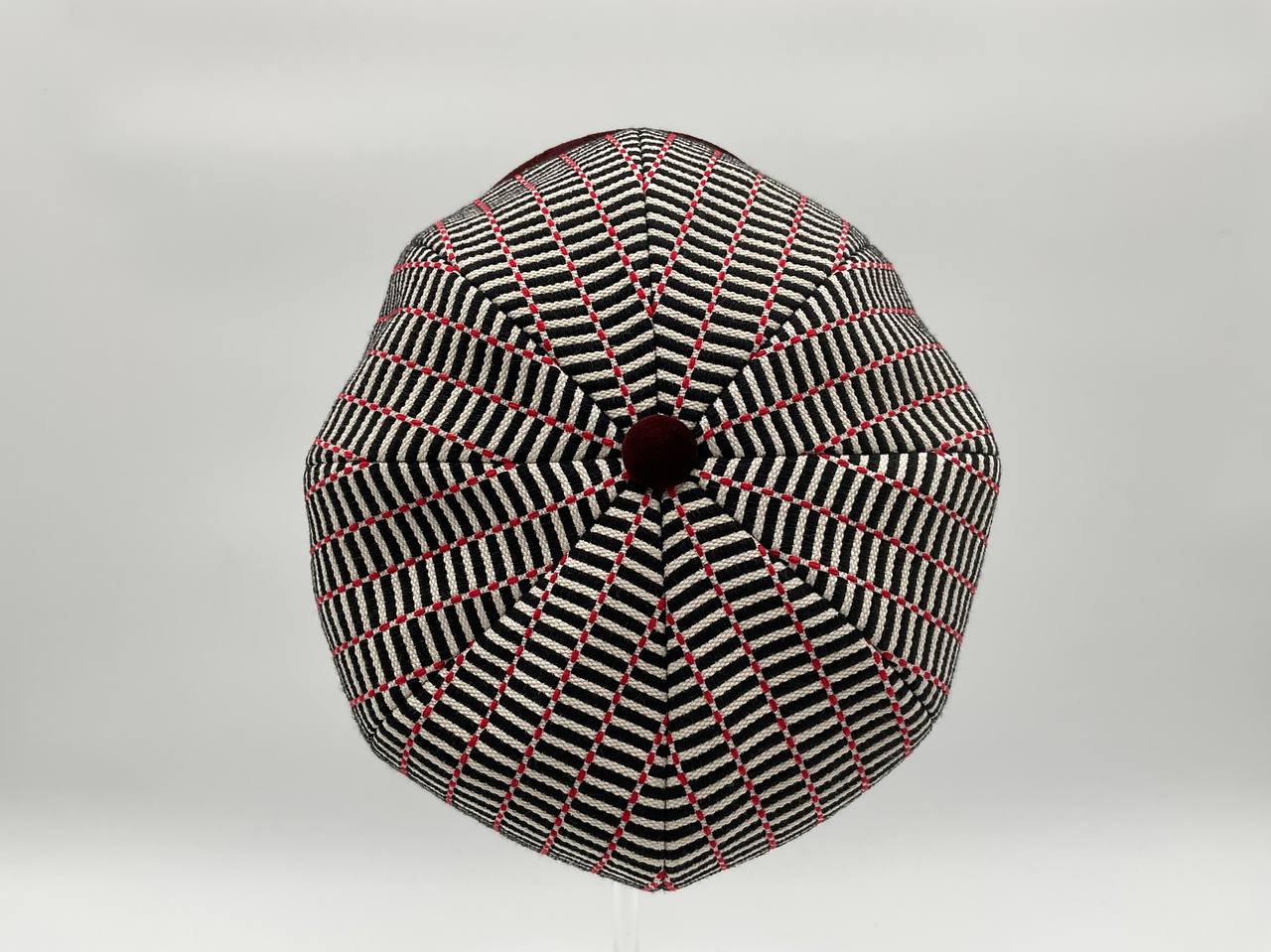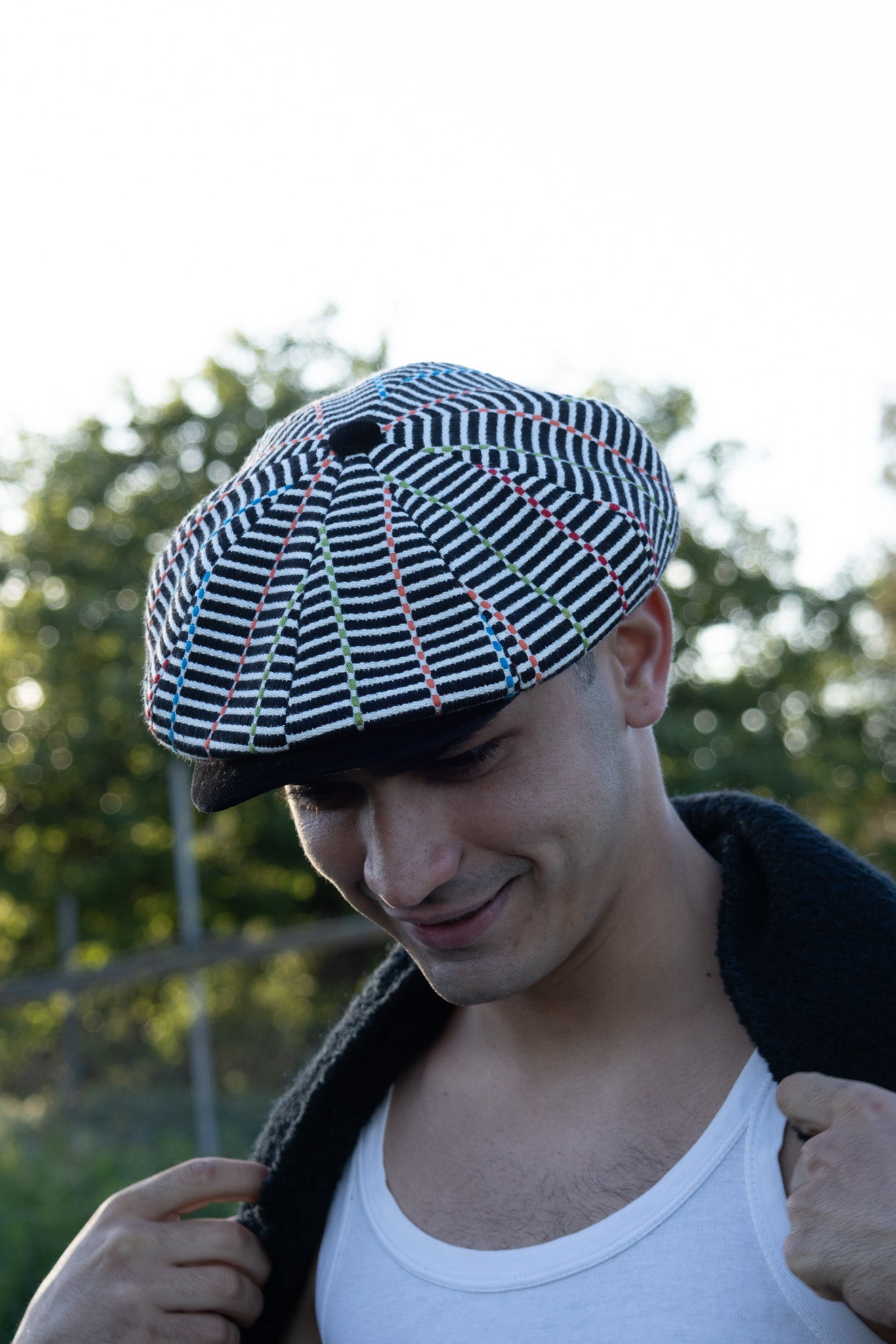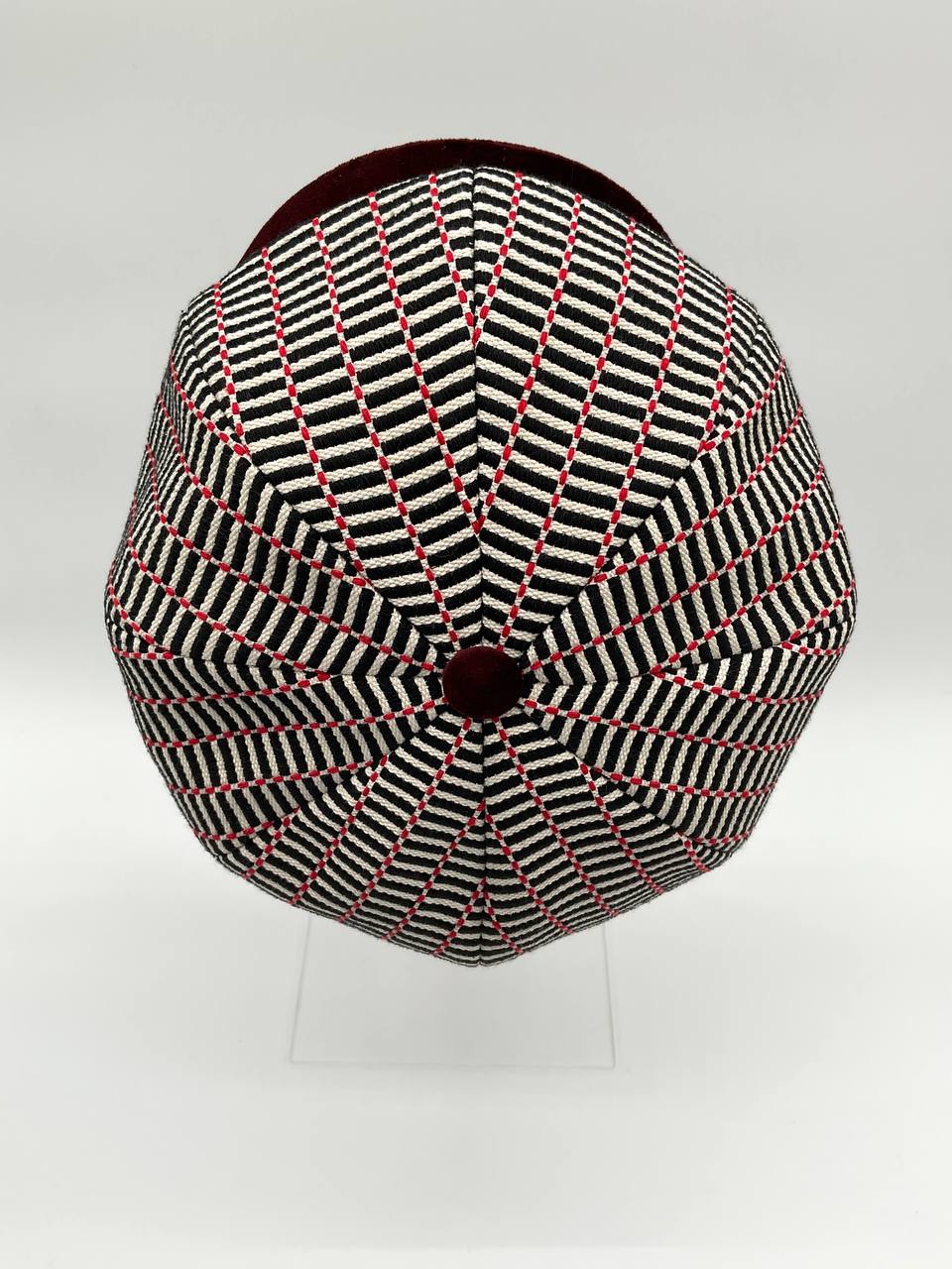 Il Newsboy ricorda il tipico berretto da "strillone" dei primi del novecento, con la classica visiera rigida e curva ma un corpo più rotondo composto da otto pannelli con un bottone in cima. Un berretto unisex, simbolo di stile retrò. In questa versione è in tessuto “Bisaccia” di cotone. La trama presenta un motivo geometrico con righe verticali in alternanza di tessuto rosso e blu o bianco e colore (rosso, blu, beige, verde, rainbow, nero), tipica lavorazione di intreccio Sardo. Visiera, bottone centrale e fascia circonferenza sono in tessuto jeans, o velluto in contrasto. La fantasia rimanda alle tradizionali stoffe utilizzate per realizzare tappeti e la tipica bertula”, la bisaccia Sarda che i pastori utilizzavano per contenere i viveri.